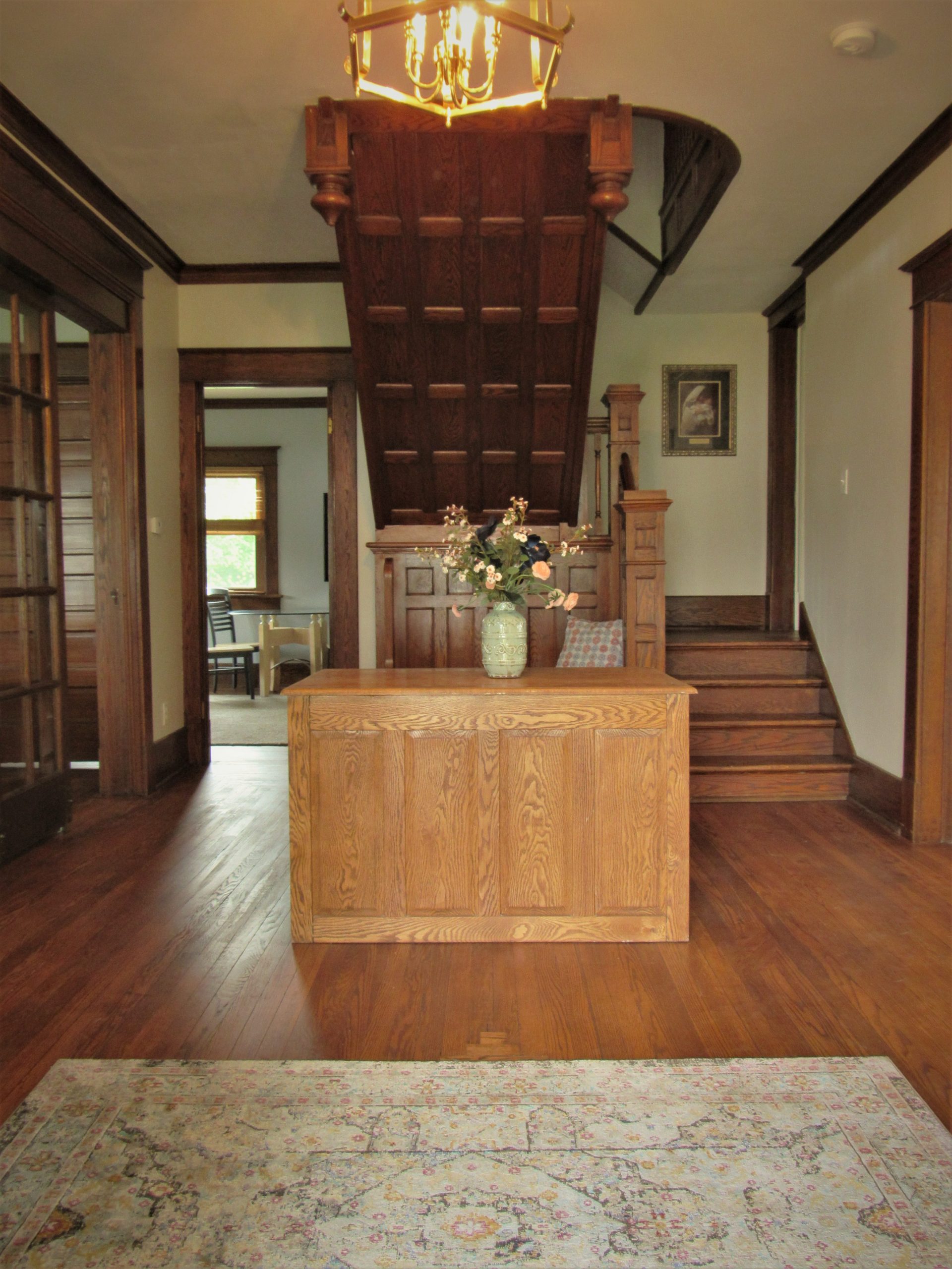 The original hardwood floors hiding under the carpet needed no repairs.  A long weekend of tearing out carpet, pad, and staples by the Knights and their families and a long, tedious day of sanding from my husband brought out the original beauty in these oak floors.